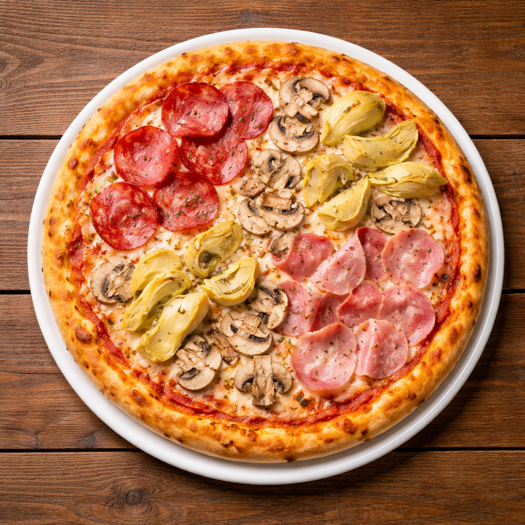 Tomaten, Käse, Salami, Formfleischvorderschinken, Champignons und Artischocken