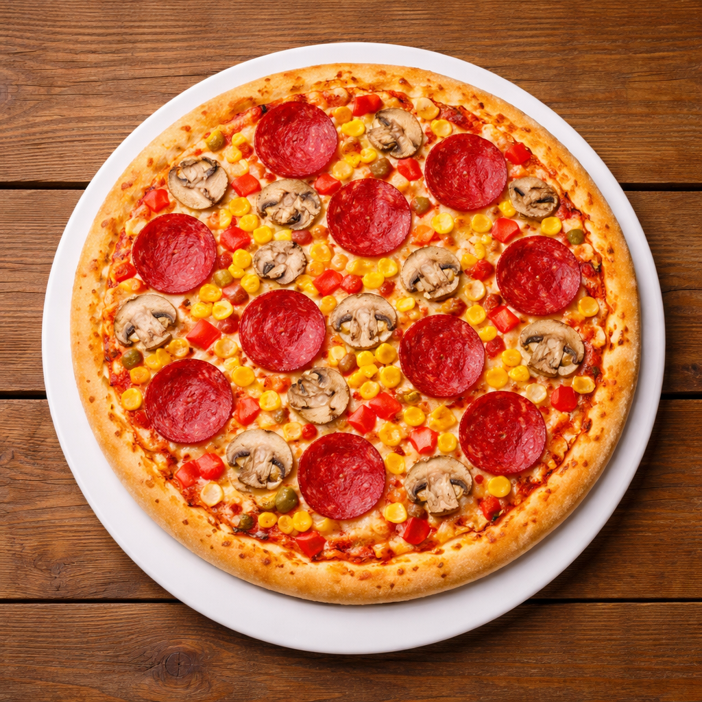 Tomaten, Käse, Salami, Champignons, Mais und Paprika