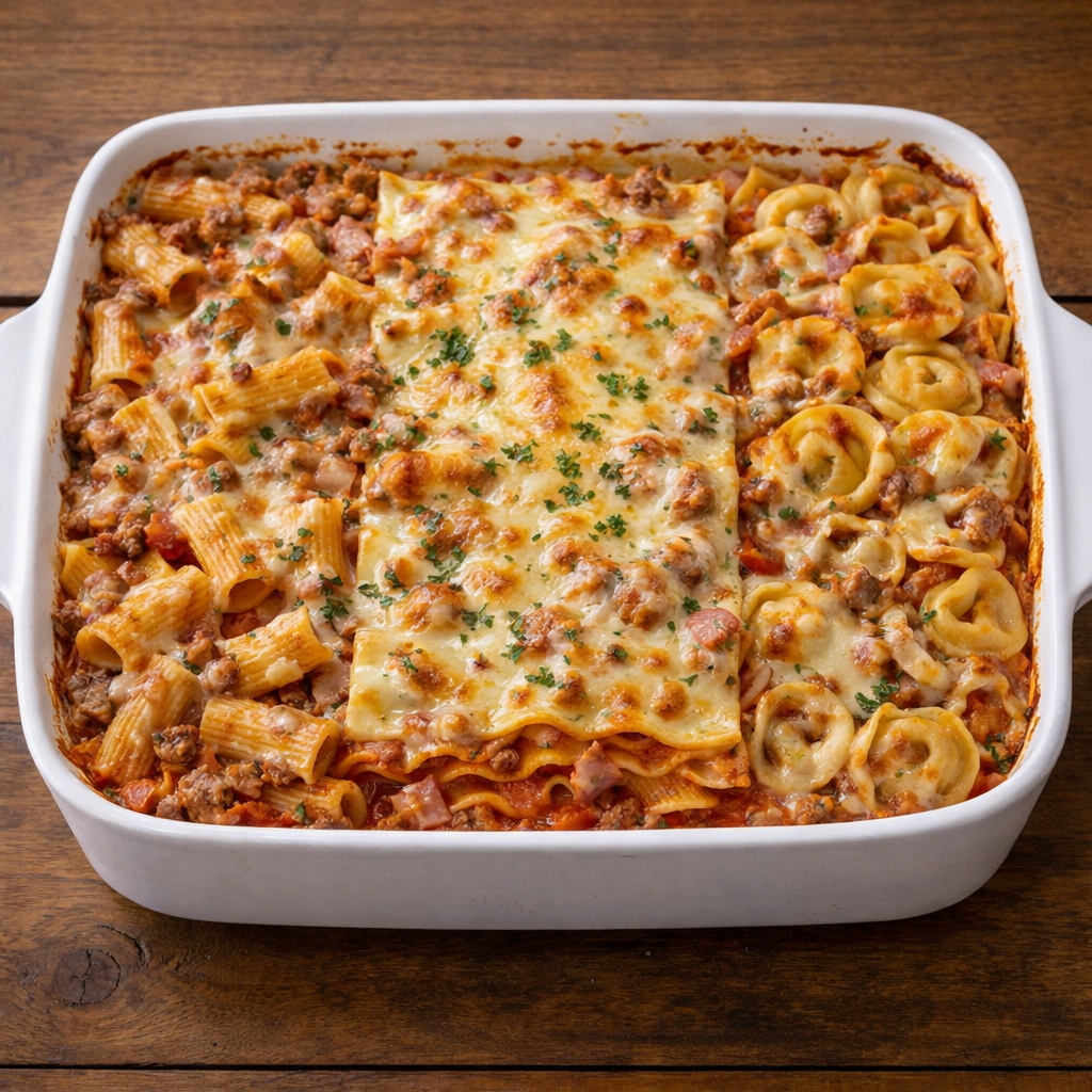 Rigatoni, Lasagne, Tortellini mit Tomaten, Hackfleisch, Sahne überbacken