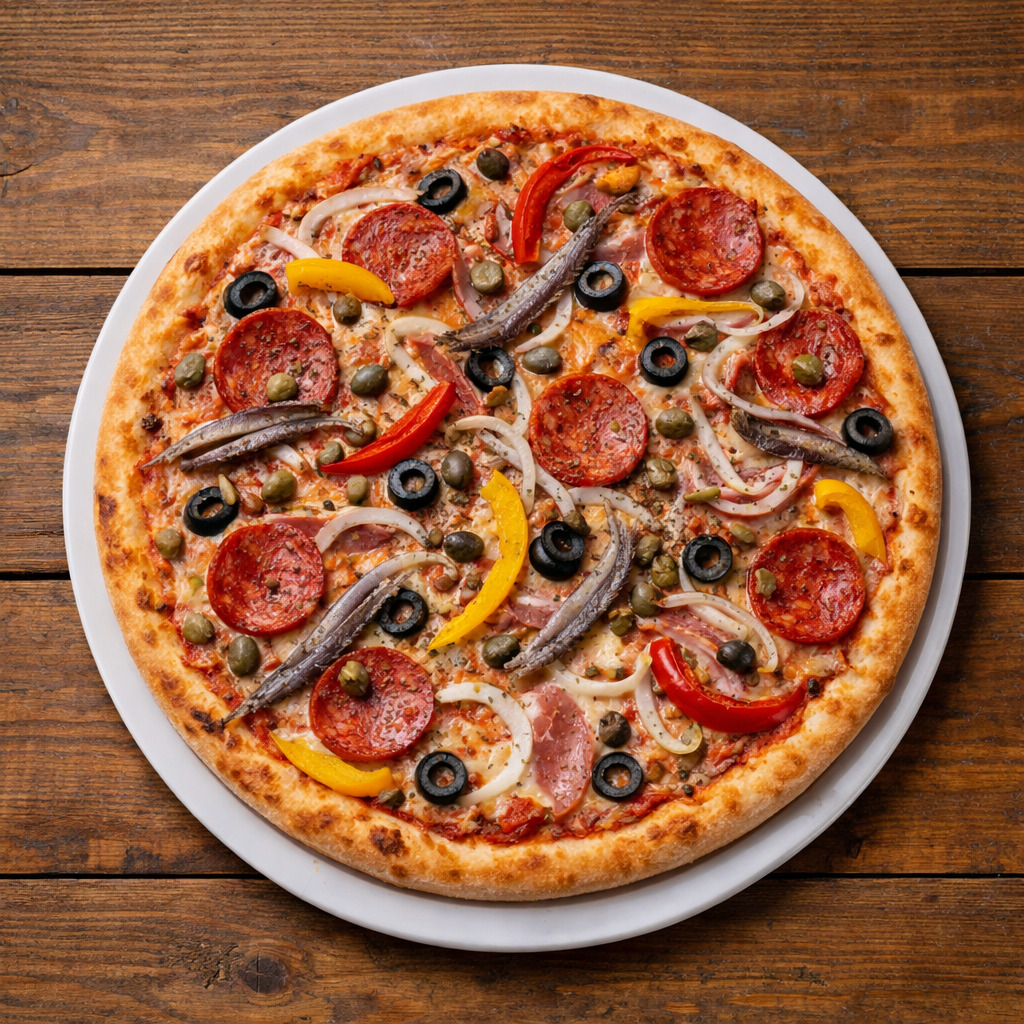 Tomaten, Käse, Zwiebeln, Kapern, Paprika, Salami, Sardellen und Oliven