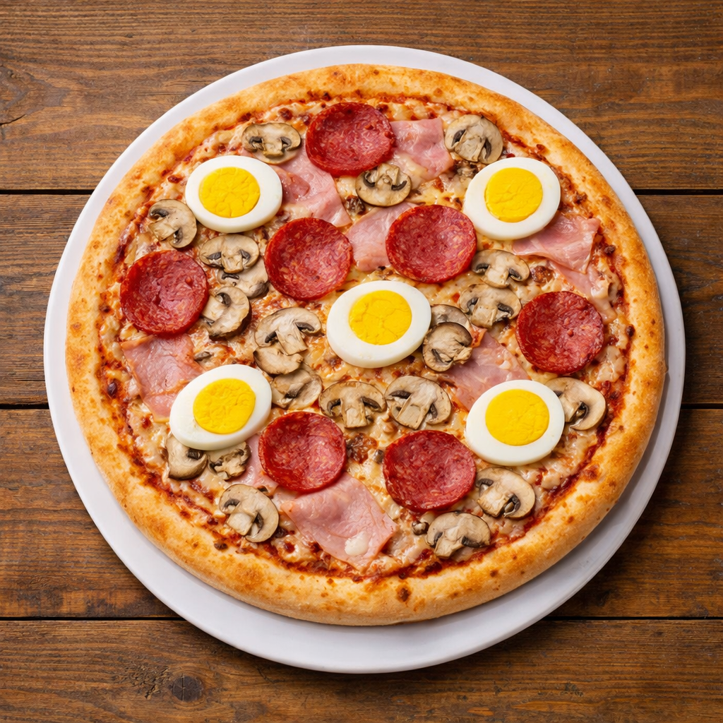 Tomaten, Käse, Salami, Ei, Formfleischvorderschinken und Champignons